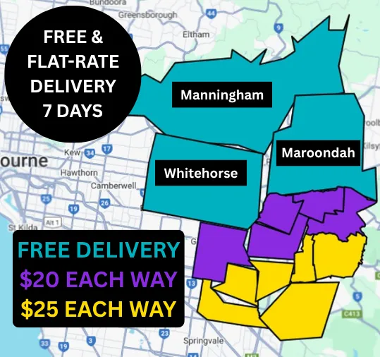 Supporting projects within Victorian suburbs 7 days a week with free delivery to Manningham - Bulleen, Doncaster, Doncaster East, Donvale, Templestowe, Templestowe Lower, Park Orchards, Warrandyte, Warrandyte South, Wonga Park, Ringwood North. Whitehorse - Blackburn, Blackburn North, Blackburn South, Box Hill, Box Hill North, Box Hill South, Burwood, Burwood East, Forest Hill, Mitcham, Mont Albert, Mont Albert North, Nunawading, Surrey Hills, Vermont, Vermont South. Maroondah - Bayswater North, Croydon, Croydon Hills, Croydon North, Croydon South, Heathmont, Kilsyth South, Ringwood, Ringwood East, Ringwood North, Warranwood, Park Orchards, Vermont, Wonga Park. Plus flat-rate delivery to Glen Waverley, Wantirna, Wantirna South, Bayswater, Boronia, Scoresby, Wheelers Hill, Knoxfield, Ferntree Gully, Rowville and Mulgrave.